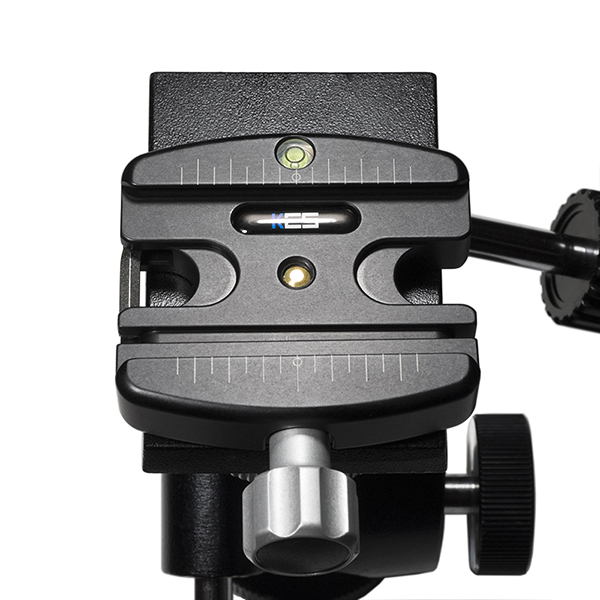The clamp, machined from a solid block of aluminum alloy, firmly grips the plate like a vise when the knob is tightened, eliminating any shifting or rattle. A common feature of Arca-Style clamps is that the plate can be slid by simply loosening the opening/closing knob slightly. However, KES's patented special screw drives the knob, allowing you to secure your equipment by simply placing it on the clamp from above and rotating it 180 degrees. A further 180 degrees in the opposite direction opens the clamp sufficiently, allowing you to remove your equipment vertically. While conventional knobs that allow you to attach or remove equipment with a single turn are already considered quick enough, the QTT knob eliminates the need to re-gripping the knob; simply turning your wrist allows you to change equipment or switch to a vertical composition.